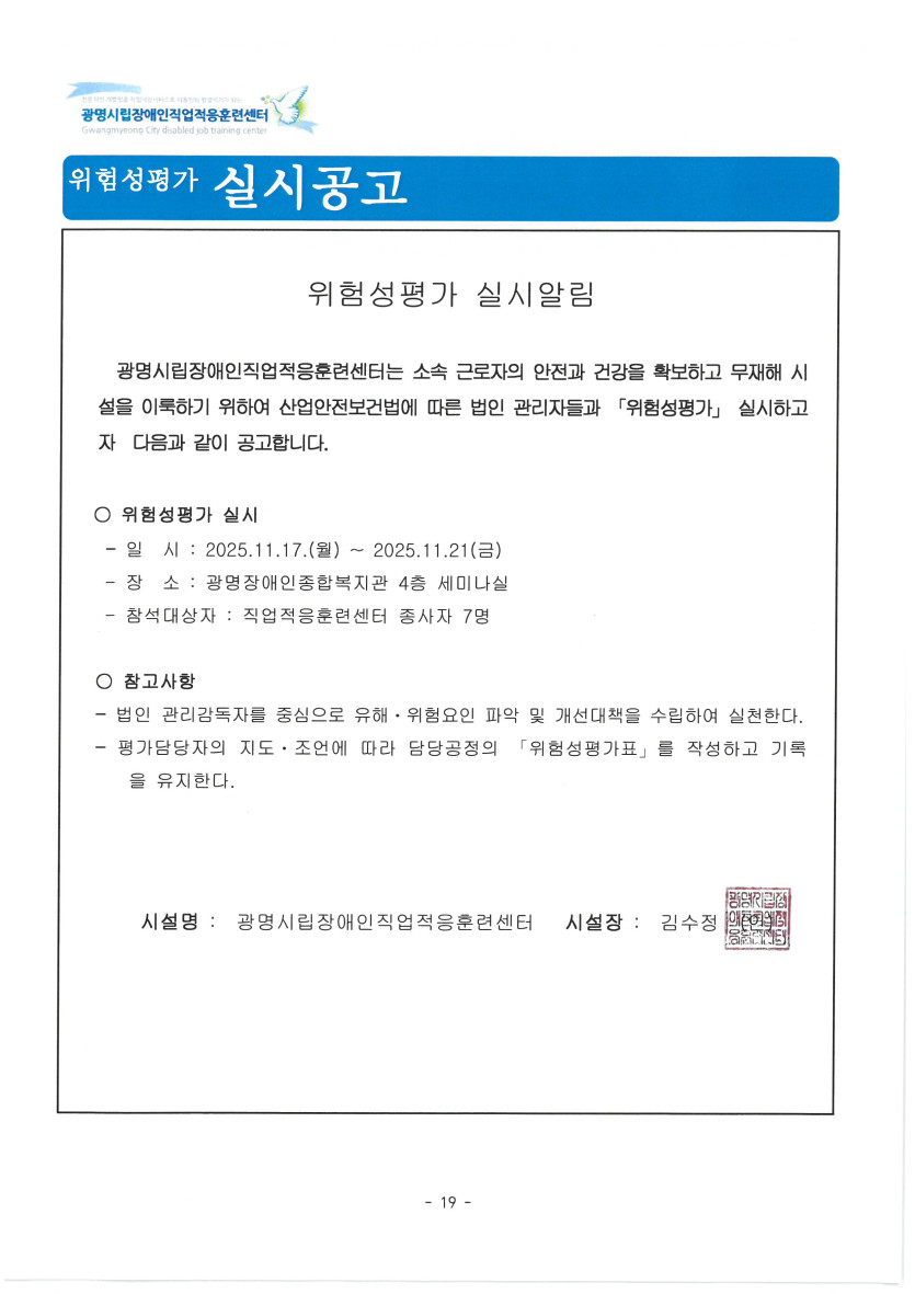 2025년 광명시립장애인직업적응훈련센터 하반기 위험성평가 실시공고